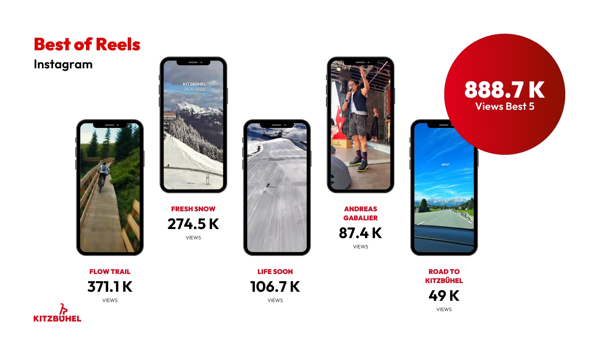 Ein zentraler Bestandteil unserer Social-Media-Strategie 2025 war die fortlaufende Produktion von Video-Content, der die Höhepunkte des Jahres eindrucksvoll präsentiert. Durch gezielte Kooperationen mit ausgewählten Marken und Content Creatorn gelang es uns, die Vielfalt Kitzbühels authentisch und reichweitenstark zu inszenieren. Besonders Eventformate aus den Bereichen Musik und Sport, wie Klassik in den Alpen, die Generali Open, KitzBeach oder das Konzert von Andreas Gabalier bieten ideale Bühnen für emotionalen Bewegtbild-Content, der die Interaktion mit der Community stärkt und durch ihre hohe Viralität neue Follower anzieht.