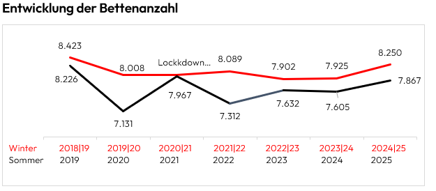 Erholsame Nächte und süße Träume wurden den Gästen in den 8.384verfügbaren Betten beschert. In der Wintersaison waren 8.250 Betten verfügbar, eine Vollbelegung war an 84,2 Tagen gegeben, dass eine Auslastung von 56,5 % entspricht. Im Sommer betrug die Bettenkapazität 7.867 wovon an 62,1 Tagen eine Vollbelegung zu verzeichnen war und somit eine Auslastung von 33,8 % zustande kam. Die Anzahl der Betten hat sich vom Winter 2018|19 bis zum Winter 2024|25 um 179Betten reduziert. Auch im Sommer ist die Bettenanzahl vom 2019 bis 2025 um 359 Betten zurückgegangen.