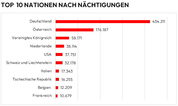 Seit Jahrzehnten an unangefochtener 1. Stelle unter dem Nationenvergleich steht Deutschland mit 434.211 Nächtigungen (Anteil 43,6%) mit einem Plus von 2,4%|+10.117 und 131.646 Ankünften (45,4 % Anteil) +2,8%|+3.595 im Tourismusjahr 2024|25. Die Nächtigungen teilen sich auf 47,3 % im Winter und 52,7% im Sommer auf. Auf Platz 2 sind wieder die österreichischen Landsleute mit insgesamt 176.187 Nächtigungen (17,7 % Anteil) zu finden. Der positive Trend setzt sich fort und die Gäste aus den USA verbuchten mit ein Nächtigungsplus von 16,8 %|+5.439 gegenüber dem Vorjahr.